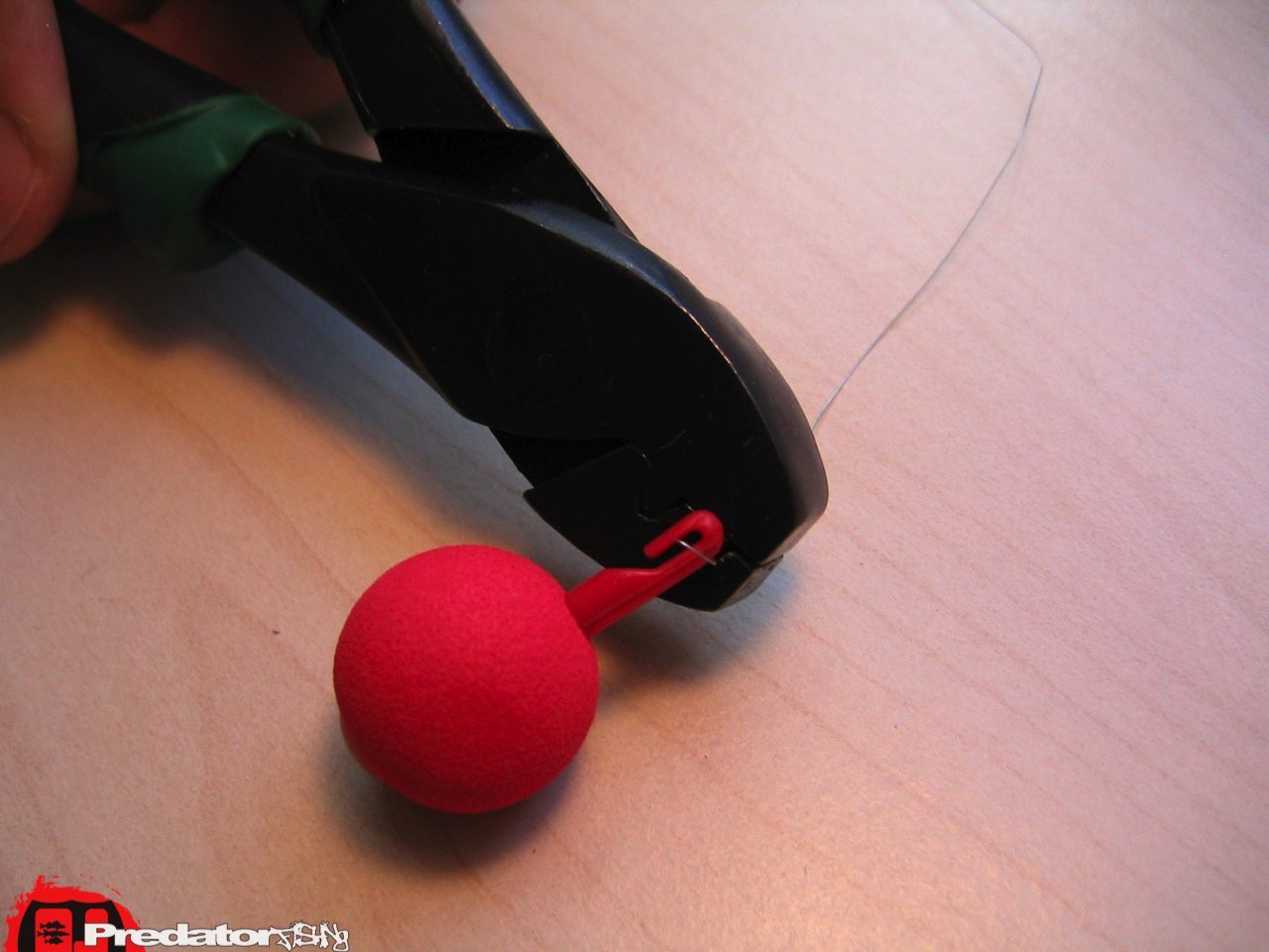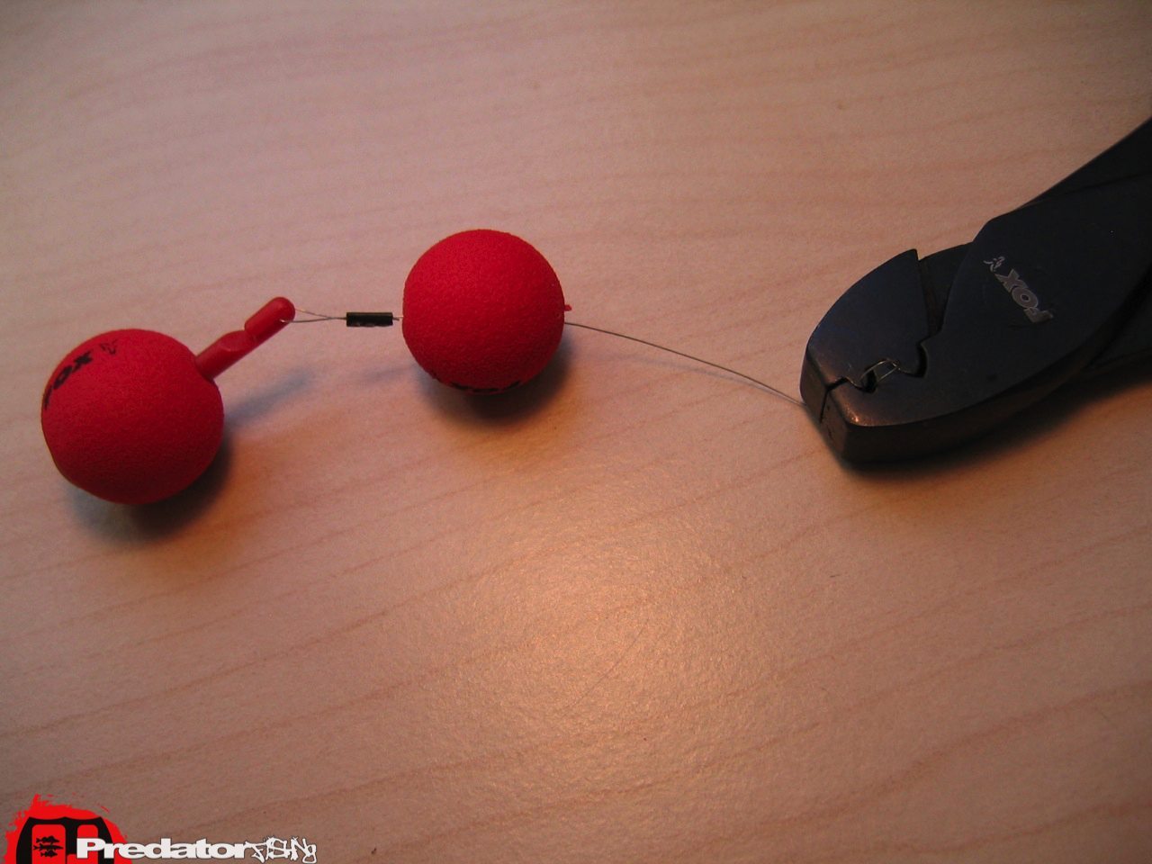 Viele Karpfenfreunde werden jetzt wohl ein bisschen schmunzeln, denn ihnen wird die Methodik wohl sehr bekannt vorkommen. Vielleicht nicht gerade in dieser Ausführung aber sie sind es gewohnt ihre Baits etwas entfernt vom Grund des Sees oder Teiches anzubieten. Auch bei den englischen Raubfisch- Profis hat es sich eingebürgert, den Köderfisch sogar für den Hecht schwebend über dem Boden anzubieten und sie verzeichnen mit dieser Technik sehr gute Fangergebnisse… Ich selbst fische seit 2 Jahren immer wieder genau nach dieser Methode und kann nur sagen es hat sich ausgezahlt. Jetzt werden sich viele von euch denken… was labert er da von Popup’s & Co, ist ja alles ein alter Hut… OK, einen Köderfisch mit einem Styropor zum schweben zu bringen ist echt schon eine verdammt alte Methode und bewährt sich noch immer Tag für Tag an den Gewässern, jedoch was macht man wenn der Köderfisch gefroren ist? Lässt man ihn auftauen, kann man zwar Styropor oder ähnliches in ihm verstauen, oder ihn mit einer Spritze mit etwas Luft zum schweben bringen, doch der Köder wird im aufgetauten Zustand miserabel am haken halten. Und genau in diesem Moment wird die heute vorgestellte Methode zum Bringer! Man hängt den Köderfisch auf das Vorfach und hängt anschließend die heute vorgestellte Montage am Drilling ein. So, wie baut man sich nun so eine Behelfsmontage? Man nimmt ein oder zwei Bait Poppers, je nach dem wie groß der Köderfisch ist und fädelt mal einen auf den Bait Popper Stemp. Anschließend nimmt man ein Stück vom Draht und befestigt ihn mit einer Schlinge und einer Klemmhülse am Stamp. Anschließend schiebt man den zweiten Bait Popper über den Zapfen und fixiert so die Schlaufe. Am anderen Ende bildet man eine kleine Schlaufe und fixiert auch diese mit einer kleinen Klemmhülse.