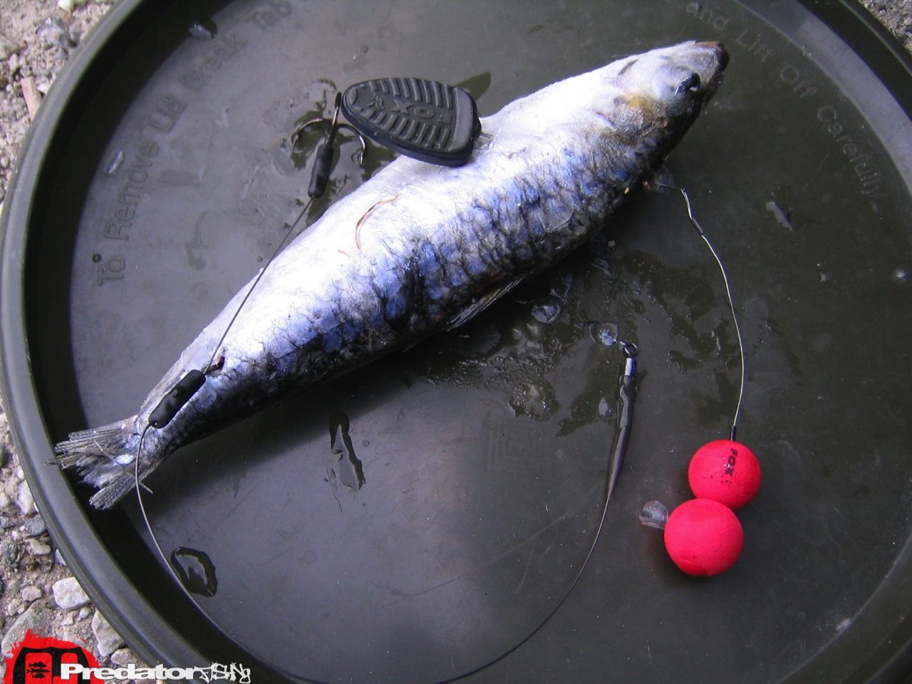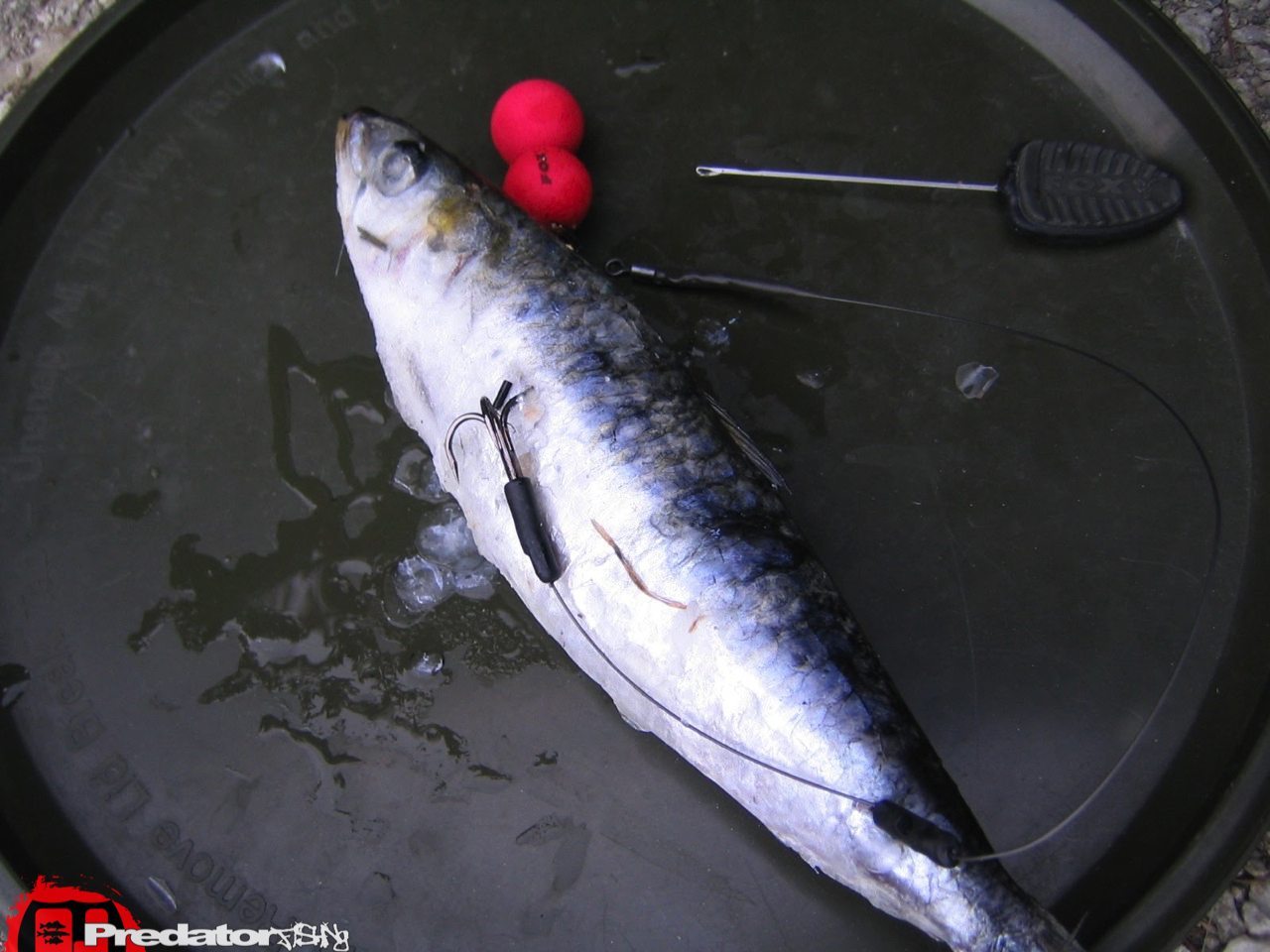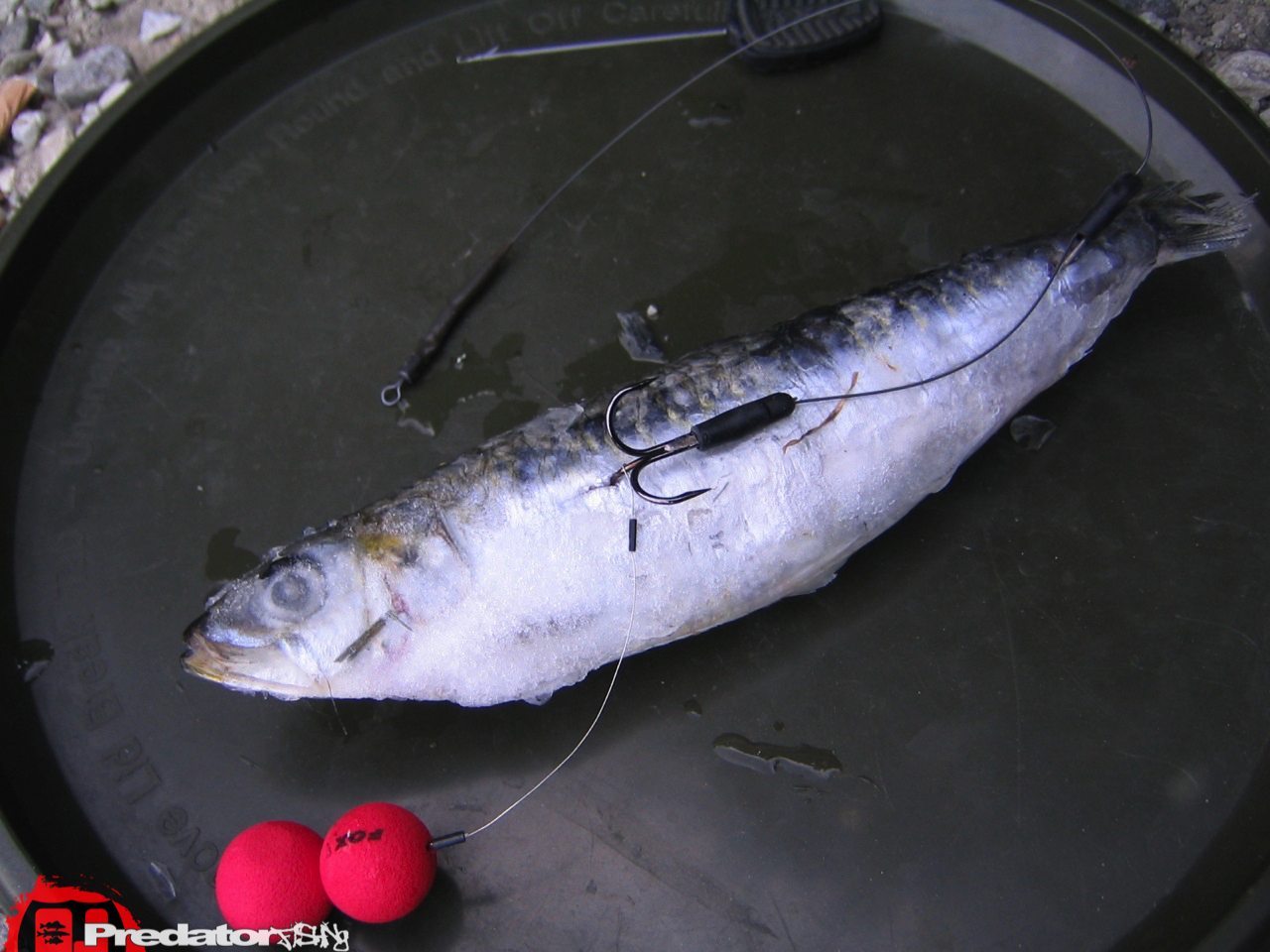 Abschließend schneidet man ein kleines Stück von einem Schrumpfschlauch ab (am besten durchsichtig, damit man die Schlaufe leichter mit der Hakenspitze trifft), schiebt dieses Stück über die Schlaufe und sticht mit dem Haken des Drillings auf dem der Widerhaken ist durch den Schrumpfschlauch und die Schlaufe. Somit ist die Bait Popper- Montage super am Haken fixiert und kann auch nicht so einfach herunterrutschen. Laut einigen Testberichten sollen die roten Bait Poppers eine zusätzliche Lockwirkung auf den Räuber haben, da sie austretendes Blut oder rote Kiemen imitieren und somit den Räuber vielleicht noch eher zum Biss verlocken könnten.Damit brachte ich auch schon die schwerste gefrorene Makrele zum Schweben und hab wirklich schon tolle Fänge verzeichnen können! So, nun kommen wir zum Aufködern einer gefrorenen Sardelle. Man sticht den Einfachhaken bei der Schwanzwurzel durch das Rückgrad, sodass die Hakenspitze auf der anderen Seite wieder rauskommt. Dann hängt man bei der einen Variante einfach den Bait Popper auf dem Schenkel des Drillings ein, mit dem man auch in die Flanke des Köderfisches einsticht oder man macht es auf einen der beiden anderen Schenkel und fixiert den Bait Popper mit einem Schrumpfschlauch wie oben beschrieben. Hat man weite Würfe mit dem Köderfisch vor empfiehlt es sich erstens die Schwanzflosse zu stutzen, da sie dem Fisch beim Werfen einen Drall gibt und sich somit das ganze Vorfach leichter verwickeln kann.