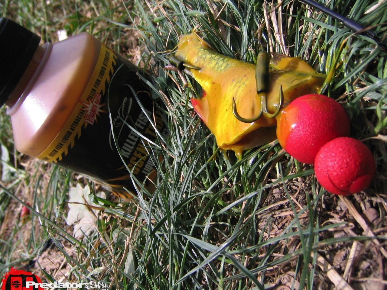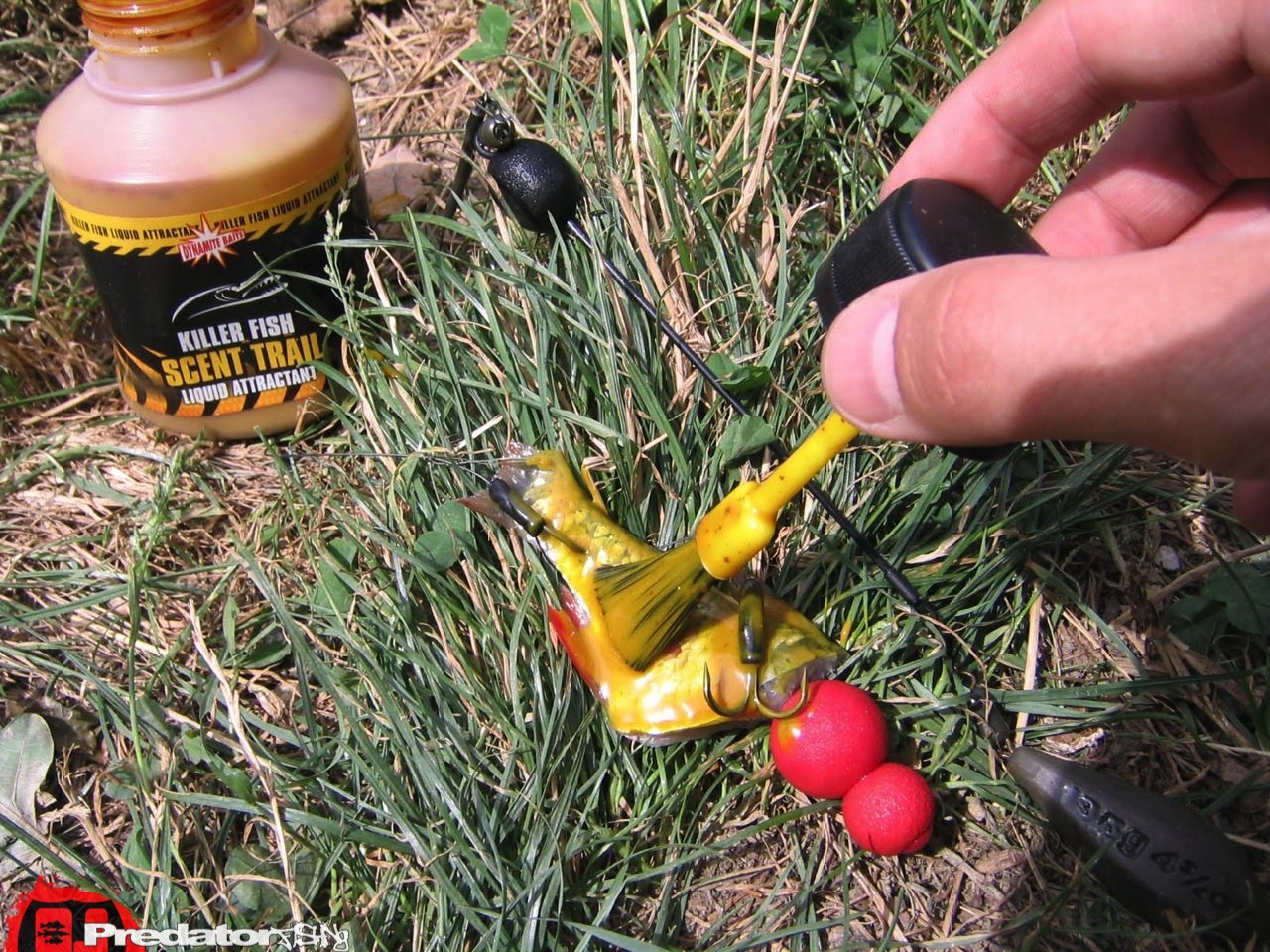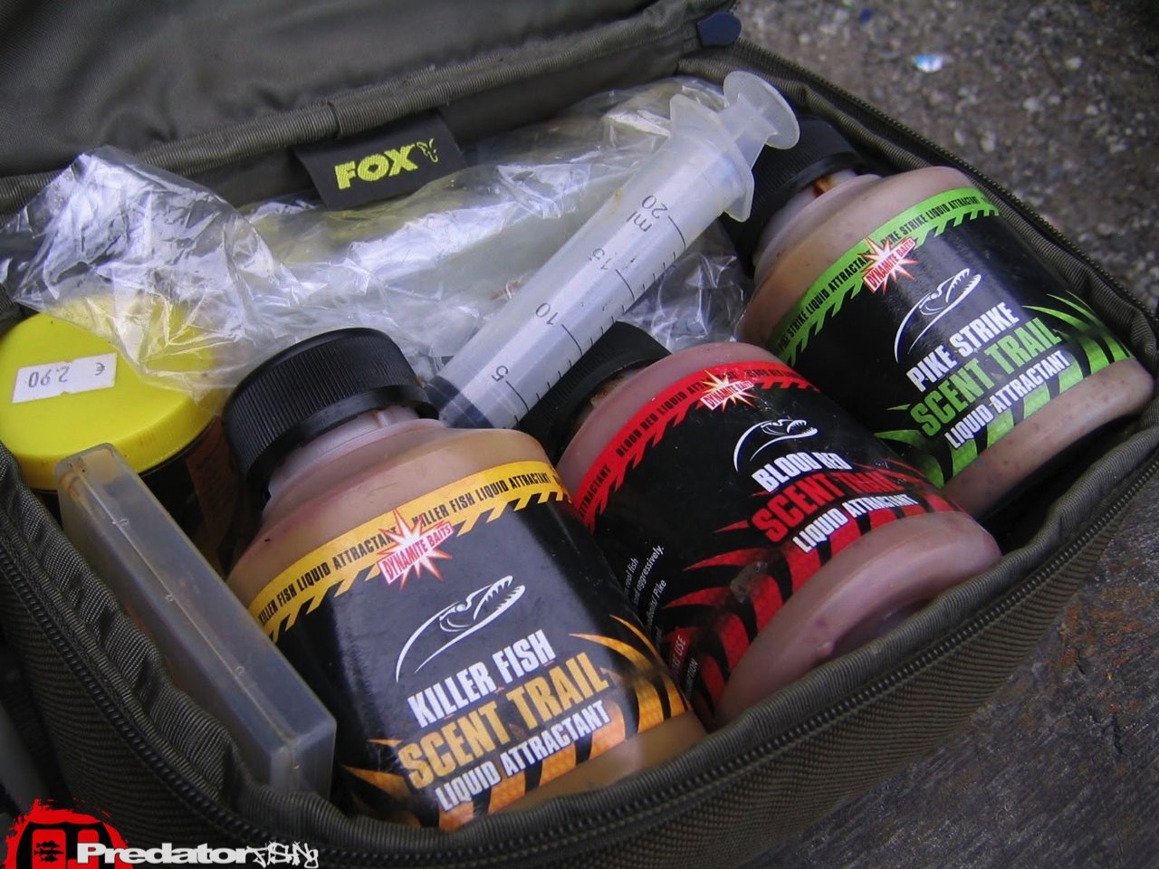 Den Zweiten Raubfisch Lockstoff, den ich immer wieder an Gewässern mit viel Futterfischangebot verwende ist „SCENT TRAIL“ von Dynamite Baits. Er stinkt wirklich nach Fisch und ihn gibt es in 3 verschiedenen Geschmacks- nein besser gesagt Gestanksrichtungen. Es ist eine zähflüssige, eingefärbte Flüssigkeit, mit feinen Partikeln untergemengt. Diese Partikel sollten Köderfische anlocken und wie man weiss lockt der Krawall der Köderfische auch so manchen Raubfisch aus seiner Reserve. Einfach mit dem Pinsel aufgetragen haftet das Zeugs wirklich