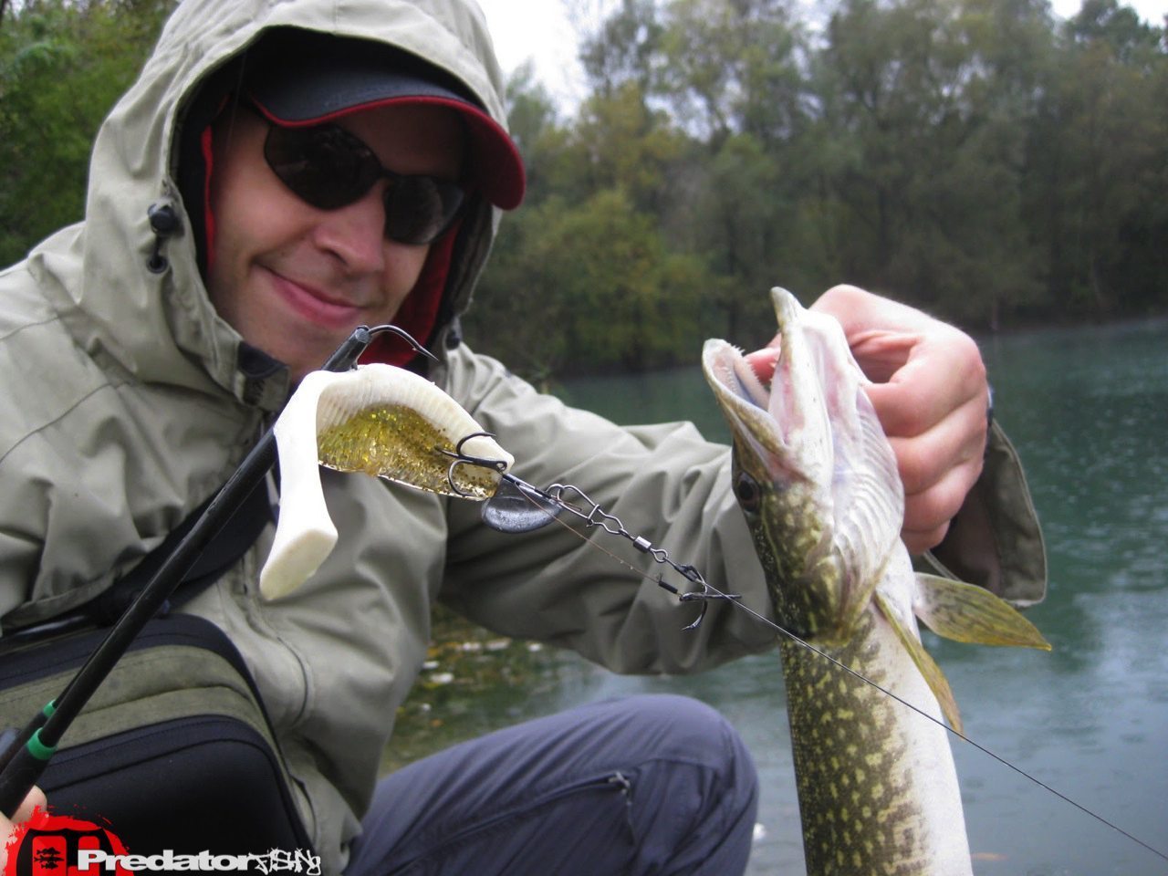 Gewechselt wurde zwischen den Farben Lolly und der schon erwähnten Farbe Goldglitter bei den FOX Rage Fish-Snax Rip Shakern und zwischen Appleseed und Lemon Tiger bei den Legend’s. Da dieses Gewässer auch Potential für schöne Zander hat wollte ich die Chance auf einen dieser beim Abtasten nicht auslassen. Im seichteren Bereich des Gewässers angekommen hatte ich die ersten Nachschwimmer und auch einige Bisse auf den weißen Schwanzteil vom Rip Shaker. Leider hatte ich nicht die passenden Stinger mit und so musste ich mir zwei meiner Rip Shaker von den kleinen Freunden zerfetzen lassen, bevor es mir gegen den Strich ging und ich den mit Doppelstingern versehenen Legend in Lemon Tiger Dekor an dieser Stelle -mit einer eigentlich komplett falschen Führungstechnik- durchs Mittelwasser zog… und ZAAAAK… zwei kleine Hechte „klebten“ aufeinanderfolgend an den feinen Drillingen dass es perfekter nicht mehr ging. Leider hatte ich meine Digicam verschlampt und nur mein Smartphone dabei, so war es mühselig in der Eile gute Fotos zu schießen. Nachdem sich die Aktivitäten an diesem Wasser wieder zurückschraubten packte ich meine