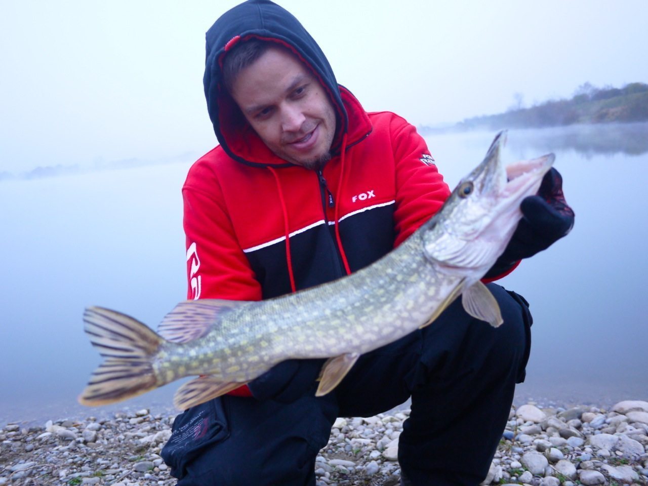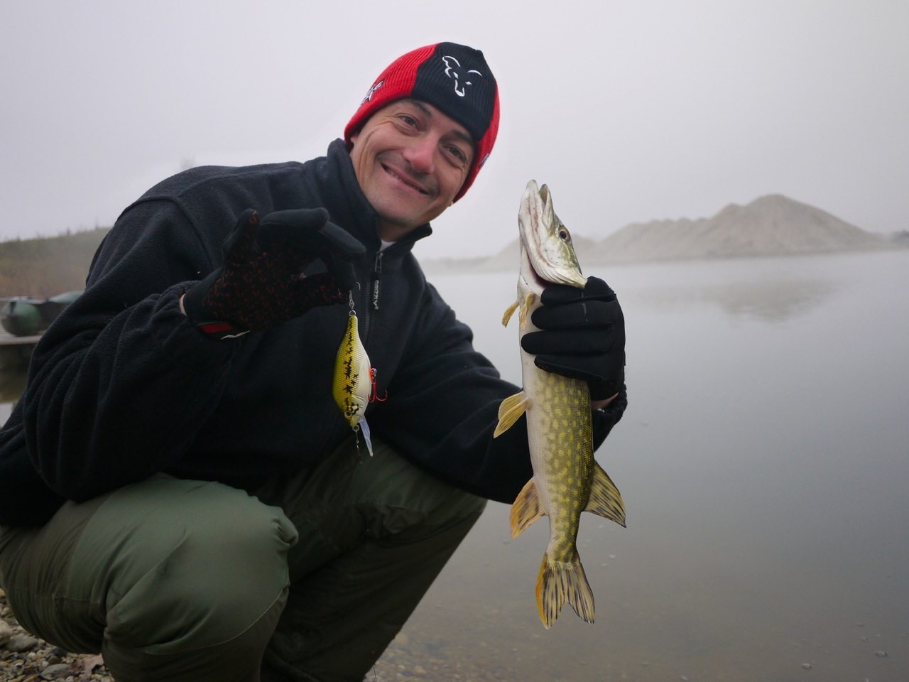 Nebel und ein leichtes Lüftchen mit Temperaturen unter Null wurden uns geboten, doch egal die Monsterhechte warteten schon mit fletschenden Zähnen auf die feinsten Kunstköder von uns serviert „on the Rocks“… Schnell haben wir noch mal im Carphunter&Co- Shop die Tackleboxen mit den neuesten Neuigkeiten aufgefüllt und sind ab, weiter Richtung Süden gebraust… Die prophezeiten Riesenmonster 😉 entpuppten sich dann als wahnsinnig aufgestachelte Teenies die uns einen lustigen Vormittag bescherten und immer wieder -in Ufernähe- wie verrückt auf unsere Köder losgingen… Einige -durch gefrorene Ringe an der Rute- abgefetzte Montagen später traten wir dann komplett durchgefroren die Rückreise zum Shop an. Der alte Karpfenspezi Markus, der zum Thema Raubfisch gern mal tiefstapelt, stellte sich über den ganzen Vormittag hinweg verdammt geschickt an und konnte somit auch einige „Zahnfische“ landen… und seinem Grinsen nach zu urteilen müssen es nicht immer „theB!gOne“ sein um glücklich zu machen… 🙂 Unterm Strich war es ein verdammt kalter, aber dennoch sehr gelungener Vormittag an einem für mich komplett neuen und unbekanntem Gewässer und obwohl die ganz großen Jungs ausblieben hatten wir -mal wieder gemeinsam am Wasser- mächtig Spaß! Danke nochmal an Markus für die Einladung und ich hoffe wir können so eine Session bald mal wiederholen…