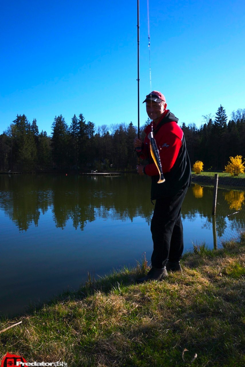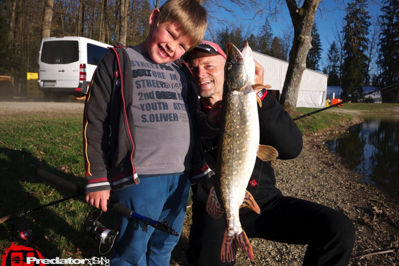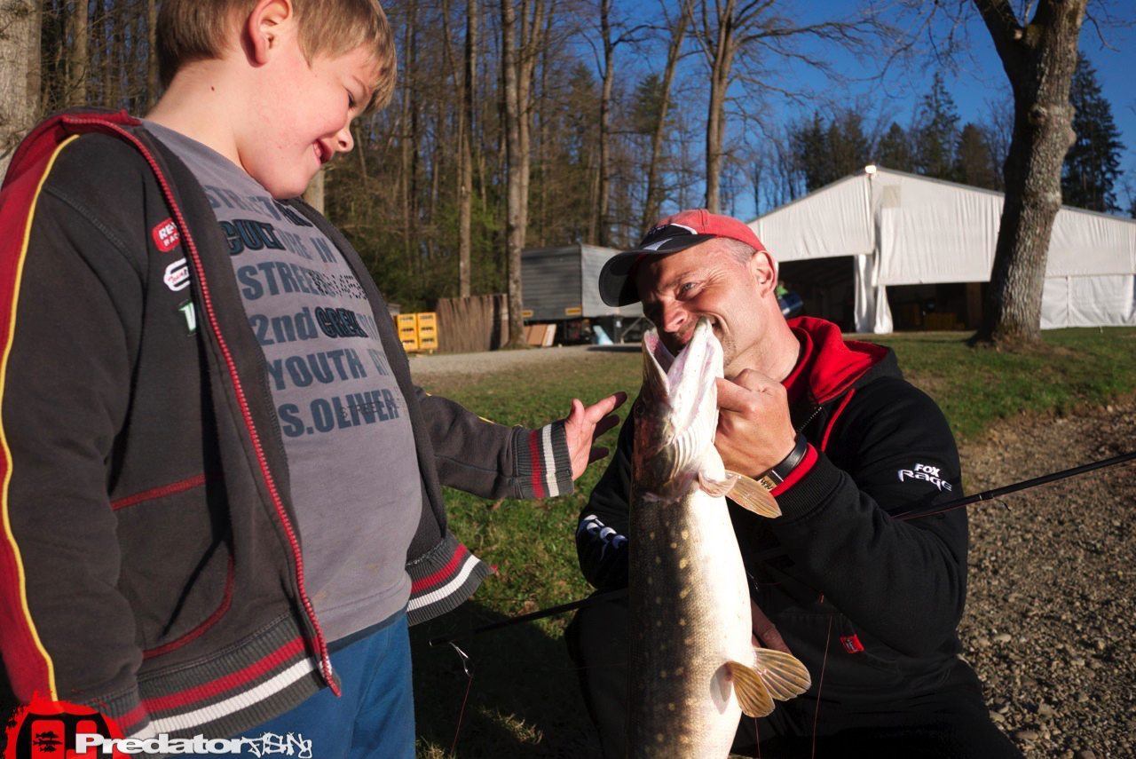 Am Vormittag verdrückten wir uns für nur ca. 20 Minuten ans Predatorlake nebenan und das genügte schon um 3 schöne Hechte für eine kurzen Fotosession zu überreden. Er hatte somit eindeutig Blut geleckt… So gegen späteren Nachmittag, als der Besucheransturm ein wenig nachgelassen hat, hat Dietmar dann klamm heimlich eine Terminator V-Jig Power und einen Jimmy in der Farbe Firetiger gepackt und machte sich ratz fatz vom Acker… klarerweise folgte ihm eine fette Menschentraube in Richtung Predatorlake um sich vielleicht doch ein paar neue Kniffe und Tricks vom Weltmeister in Action zu erhaschen. Es gingen auch hier wieder einige sehr schöne und wirklich fette Hechte welche sich in der Nachmittagssonne am Ufer aufwärmten…