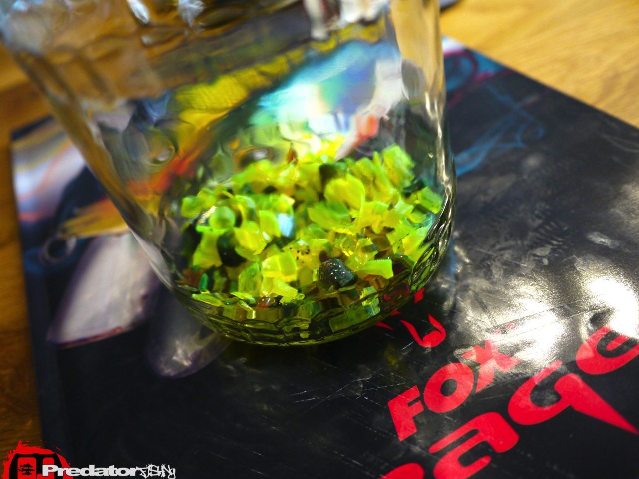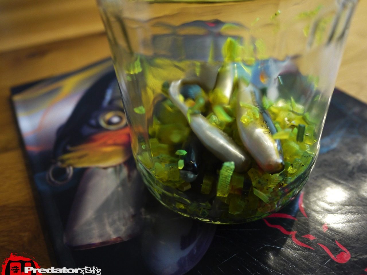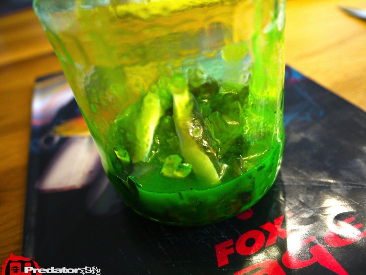 Da kam seine geniale Idee, er hatte auch schon von den anderen Teamkollegen erfahren, dass die Farbe ein Hammer war und wusste auch gleich eine Möglichkeit so einen Köder wieder hinzubekommen. Die Gummimischung war nämlich die selbe wie beim Zander PRO „Arkansas Shiner“ mit leichten Schimmerpartikeln im gesamten Körper, nur das magische Chartreuse fehlte ihm um wieder zur Urform „meines“ magischen Zander PRO zu gelangen… Wer kennt es nicht, wenn einem mal ein Köder  mit Chartreuse in der Köderbox zu den anderen Naturfarben flutschte und dieser dann alle Köder mit der leuchtgrünen Farbe besudelte… Ja, genau diesen Effekt machte ich mir auf Didi’s Tip hin zu Nutze um mir wieder so einen Hammerköder zu erzeugen… Dazu muss ich nur ein paar alte, ausgelutschte Legendes so fein wie möglich zerschnippeln und mit dem Zander PRO in „Arkansas Shiner“ in einem Glas mit ein wenig Öl stehen lassen… In den zwei Wochen hab ich das Glas immer mal wider durchgeschüttelt um die Farbübertragung schön gleichmäßig hinzubekommen und siehe da, das Ergebnis war perfekt! Leider habe ich keine UV- Aufnahme des alten Zander PRO aber der neue sieht im verdammt ähnlich und man kann auch den unterscheid zum „Black n Limd“ sauber erkennen… Dieser hat viel härtere Farbunterschiede und ist anscheinend deswegen nicht mal annähernd so fängig wie die Urversion… Ich war zwar bislang damit noch nicht an den besagten Gewässern, aber ich hab ein gutes Gefühl dass dieser Köder wieder gleich rockt wie die alte Version… Also, so einfach kann es funktionieren, will man seine Gummiköder einfärben und ihnen dadurch neues Leben einhauchen!
