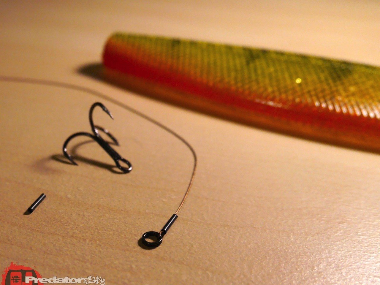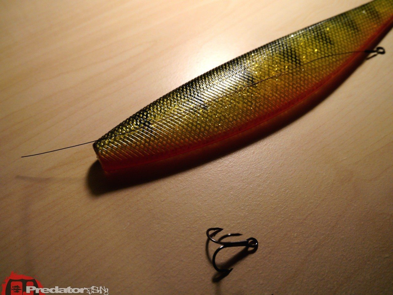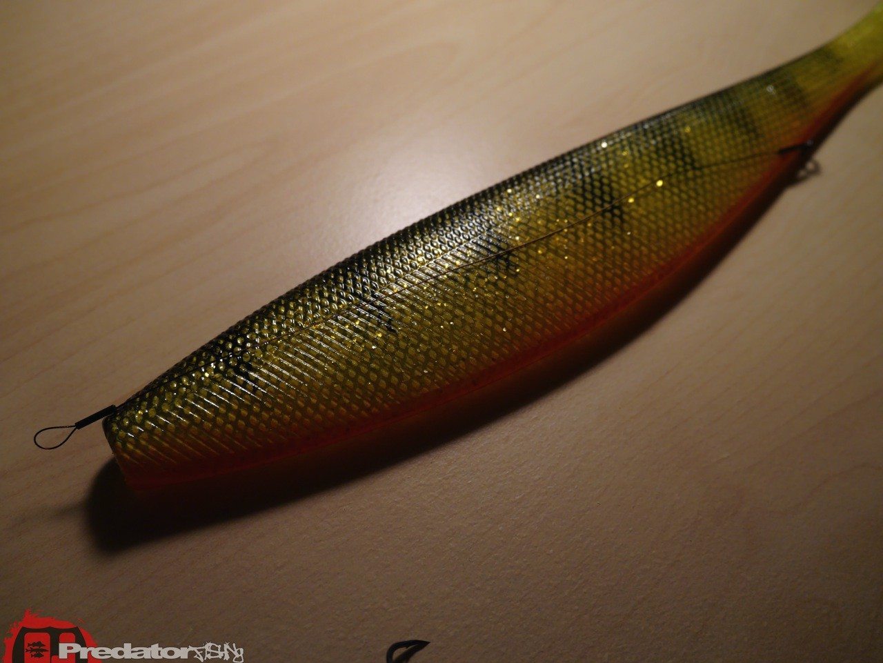 Man hört immer öfter davon, dass man mit sogenannten Monster- oder Riesenködern an gewissen Tagen richtig dicke Fische fangen kann. Doch wie bringt man bei so einem Köder mit rund 30cm Länge einen Fisch an den Haken? Nur durch den Jigkopf kann es dann wohl doch nicht funktionieren, denn meist schnappt sich vor allem der Hecht den Köder von unten auf der Breitseite wo weit und breit kein Haken vom Jigkopf zu sehen ist. Man braucht einen extra-lange Stinger. Um die Laufeigenschaften dieser Riesenköder nicht negativ zu beeinflussen macht es einfach Sinn den Haken mit einem Stahlvorfach durch den Köder in die richtige Position zu bringen. Jeder der die tiefen Einschnitte in die Gummiköder nach einem Hechtbiss kennt, weiss warum ich hierzu nur noch Stahl oder Titan verwende. Doch nur wo ist die richtige Position? Genau, an der unteren Seite des Köders am Anfang des hinteren Drittels, dort muss der Drilling auf einem Ring oder Sprengring frei hängen um den besten Fangerfolg zu erzielen. Am vorderen Ende genügt eine großzügige Schlaufe, mit einer Klemmhülse fixiert, um diese abschließend noch über die Öse des Jighakens zu fädeln und sie schlussendlich mit dem Karabiner des Vorfaches zu fixieren. Will man ganz auf Nummer sicher gehen, kann man noch einen kurzen, außen verlaufenden Stinger im vorderen viertel des Köders an der Flanke anbringen um die „Kopfbeisser“ unter den Raubfischen auch sicher an den Haken zu bekommen, in den meisten Fällen genügt aber die erste Variante vollkommen um die Raubfische an den großen Lappen zu fesseln. Bei den Bildern könnt ihr Schritt für Schritt sehen wie die Montage am besten zu bauen ist… also viel Erfolg damit und ab ans Wasser mit euch! cu -stone-