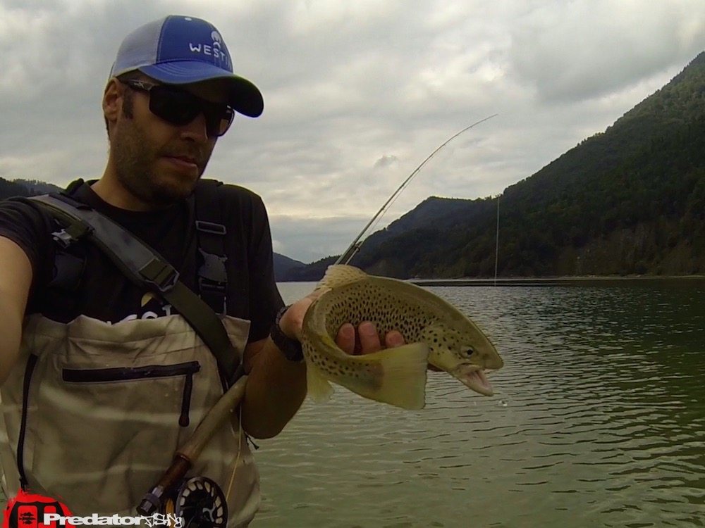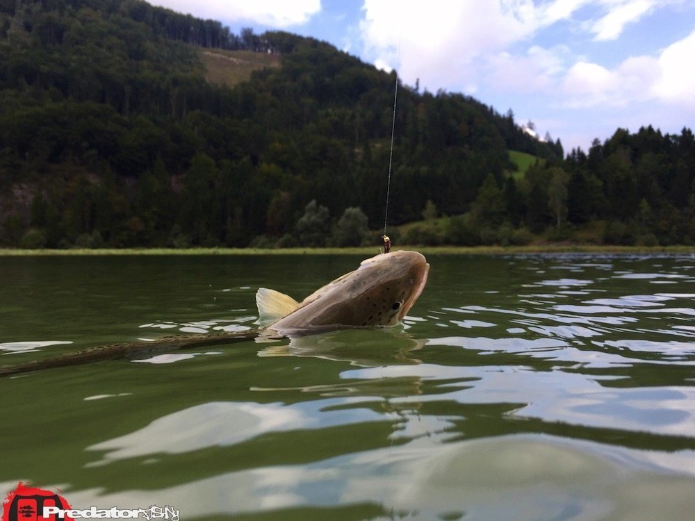 Da ich einen ganzen Tag lang Zeit zum Angeln hatte, wollte ich sowohl ein wenig mit der Fliegenrute, als auch mit dem Spinntackle mein Glück versuchen und da kam auf meine Frage hin gleich der Wiestalstausee wie aus der Kanone geschossen. Im Einlaufbereich des Stausees gibt es beim richtigen Wasserstand des Stausees ein genial flaches Ufer, um die Forellen und Saiblinge mit Fliege und Nymphe anzuwerfen und das komplette Ufer auf der Straßenseite ist mit der Spinnrute befischbar. Alle 100 Meter gibt es dazu Parkmöglichkeiten und relativ gute Abstiegmöglichkeiten zum steinigen Ufer. Neben Bach-u. Regenbogenforelle bzw. Bach-u. Seesaibling sind im Wiestalstausee Seeforellen, Schleien, Hechte, Karpfen und Zander vorhanden. Im Einlaufbereich, welcher ab dem 15. September leider im oberen Abschnitt (100m abwärts der Brücke), gesperrt ist (weil sich dort die Saiblinge zum Ablaichen einstellen), konnte ich dennoch einige Forellen auf der Nymphe reizen und es machte riesig Spaß mit dem Fliegensetup im Flachwasserbereich herumzujagen. Am späteren Nachmittag versuchte ich dann noch mit meinen Gummifischen die Hechte im unteren Bereich des Stausees zu Reizen, aber bis auf ein paar Nachschwimmer der mittelgroßen Liga lief an diesem Tag dann diesbezüglich nicht viel.