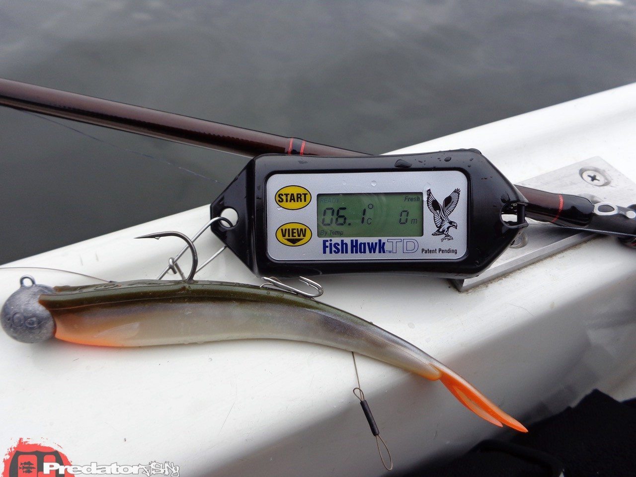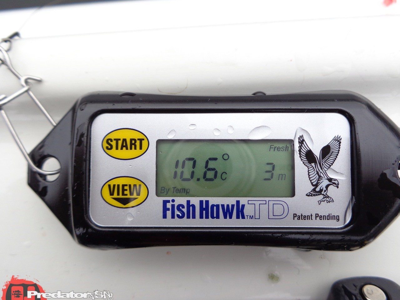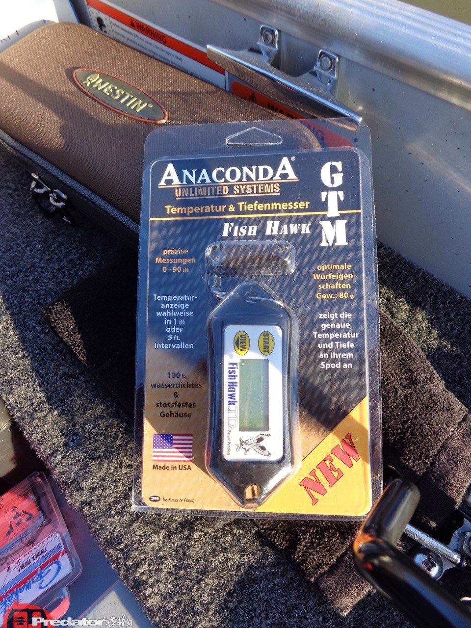 Heute geht es mal um den FISH HAWK Temperatur und Tiefenmesser… Das ganze Jahr über entscheiden gewisse Einflüsse im Wasser über unseren Fangerfolg. Wenn auch nicht immer für uns sofort nachvollziehbar, sind es doch die Parameter wo sich der Fisch aufhält, oder nicht. Wir wissen dass wir im Sommer auf der Wind zugewandten Seite unseren Fisch finden, und im Winter meistens das Gegenteil der Fall ist. Ursache, Temperatur und Sauerstoffgehalt ! Im Sommer das wärmere und saustoffreicher Wasser an der Windseite, und im Winter das „noch“ wärmere Wasser an der Wind abgewandten Seite. Nicht immer herrscht Wind an unseren Angeltouren, und wie weiß ich jetzt wo sich unsere „heißen“ Bereiche befinden, die auf Fisch hoffen lassen? Dafür hat es schon vor langer Zeit den GTM 40 T+ am Markt gegeben, der die Wassertemperatur in 2m Schritten gemessen hat. Ein tolles Gerät zum erkunden der Temperaturschichtung mit gleichzeitiger Tiefenmessung. Irgendwann war dieses Gerät aber bedauerlicherweise wieder vom Markt verschwunden. Umso mehr freute es mich eine Wiederbelebung von diesem Gerät durch die Firma ANACONDA erleben zu dürfen! Mit dem FISH HAWK Temperatur&Tiefenmesser!!! Der FISH HAWK ist eine Tuning-Version der Spitzenklasse aus dem GTM 40 T+. Da wurden wirklich jegliche Verbesserungen erkannt und umgesetzt! Das Erste was sofort ins Auge sticht, ist die gedrungene Gehäuseform. Sie gleicht einem Senkblei und bietet weniger Widerstand in der Absinkphase als sein Vorgänger der GTM 40T+, der Breit und Seitenschmal war, noch dazu mit geringem Eigengewicht. Der FISH HAWK Temperatur und Tiefenmesser wiegt 80g! Dadurch sinkt er zügig zu Boden, ohne sofort abzudriften, das beim GTM 40 T+ immer der Fall war. Die Inbetriebnahme und die Menüführung des FISH HAWK Temperatur und Tiefenmesser lassen sich durch die beiden großen Tasten START und VIEW super leicht bedienen, und das auch mit Handschuhen. Super verständliche Bedienungsanleitung in Deutsch inklusive. Zum Gerät wird ein großer Karabiner mitgeliefert, indem man schnell und einfach eine Verbindung mit der Montage am Angelgerät herstellen kann.