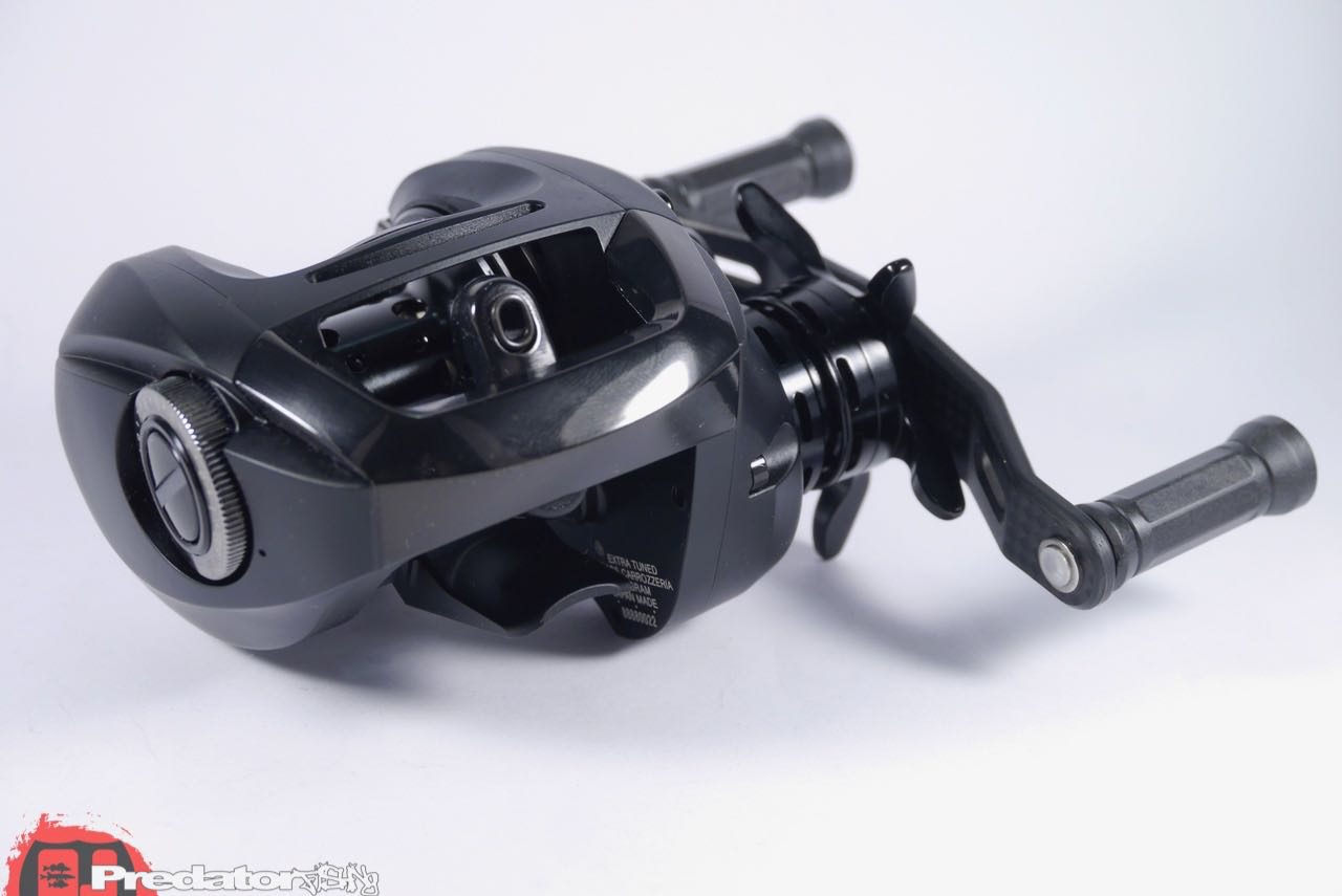 In der Basis gleichen sich die beiden Baitcaster, da sie auf dem selben Getriebe (mit Duralumin Antriebszahnräder) und Gehäuse aufgebaut wurden. Die Steez von Daiwa ist sicher ein perfekte Baitcaster für die beschriebenen Ansprüche, dennoch hat mich dann die limitierte  Racing Edition vom Design und den Performance Parts her mehr angesprochen. Wie erwähnt basiert die Megabass LARIAT IS63 auf dem Steez Modell 100HL inkl. dem bekannten MagZ Bremssystem. Aufgemotzt wurde das eigentlich schon geniale Steez- Gehäuse dabei mit schwarzverchromten Inbusschrauben welche das Gehäuse der Megabass zusammenhalten und schmalen schwarzen Aluminium Knobs auf einem 80mm Carbon Handle. Der lila Bremskörper auf der aus Aluminium gefertigten, extrem getunten Spule ist ein Augenschmaus, doch für Performance sorgen die speziellen Ausnehmungen, welche neben einer Gewichtsreduktion auch eine verbesserte Beschleunigungsleistung ermöglichen. Sowohl die Stern-, als auch die Spulen- und Wurfbremse lassen sich alle mit einem ganz feinem aber extrem präzisen und straffen „Klicken“ auf die Gegebenheiten wie dem Ködergewicht einstellen und das ohne dem geringsten Backplay. Die Megabass LARIAT IS63 ist durch die extrem leichte Bauweise eine Baitcasterrolle, mit der man mit Leichtigkeit auch kleinste Köder werfen kann, denn selbst bei windigen Verhältnissen, meistert sie saubere Würfe ohne grosse Probleme und abgesehen von den vielen Performanceverbesserungen sieht die pechschwarze Megabass LARIAT IS63 einfach grenzgenial aus! Bespult wird das edle Teil von mir natürlich nur mit dem feinsten Zwirn und so hab ich mir dazu gleich auch noch die Megabass Dragon Call Cayien PE bestellt, um das Edel- Paket dementsprechend abzurunden. Auf welcher Rute das gute Stück dann schlussendlich zum Einsatz kommen wird, werde ich später verraten, denn wer mich kennt weiss, dass ich mir solche Schmuckstücke nicht in die Vitrine stelle, sondern in den Genuss kommen will, das Wunderding aus der ITO- Schmiede auch zu fischen! Und eines noch… über den Preis spricht man bei solchem Tackle nicht mehr, das würde nur den Genuss schmälern 😉