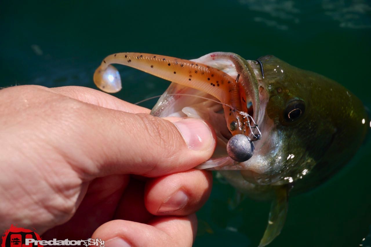 Obwohl der Köder grundsätzlich in seiner Körperform sehr lang erscheint, kann der Raubfisch ihn dennoch bei der Attacke sehr einfach einsaugen, da er sich durch die Querbohrung extrem leicht zusammenfalten lässt. Dieser Effekt ist beim Bild zum Schwarzbarsch in der Galerie sehr schön zu sehen… Der kleine Westin KickTeez lässt sich am besten mit einem 5g Jigkopf ganz geschmeidig über den Gewässergrund führen und sogar relativ problemlos durch Krautfelder jiggen. Ein Stinger ist bei dieser Größe nämlich nicht notwendig, da sich die Raubfische durch dieses Konzept den Köder so richtig reinpfeifen können. Der 15cm KickTeez ST hingegen ist mit seinem Stinger im hinteren Drittel ein richtiger Krautfänger. Erstens fängt sich schon beim 10g Jig am Kopf viiiiiel mehr Kraut als bei der kleinen Version mit den 5g und noch dazu sammelt er jegliches Kraut von unten über den integrierten Stinger auf. Auch wenn man ihn bis zu den Hakenschenkeln im Westin KickTeez versteckt bringt das nichts, er sammelt alles ein was ihn beim Einholen so streift. Daher sollte man den Köder dann doch eher an Spots einsetzen, an denen wenig krautige Gefahr auf ihn lauert, denn da kann er seine ganze Macht entfalten und fängt extrem gut.