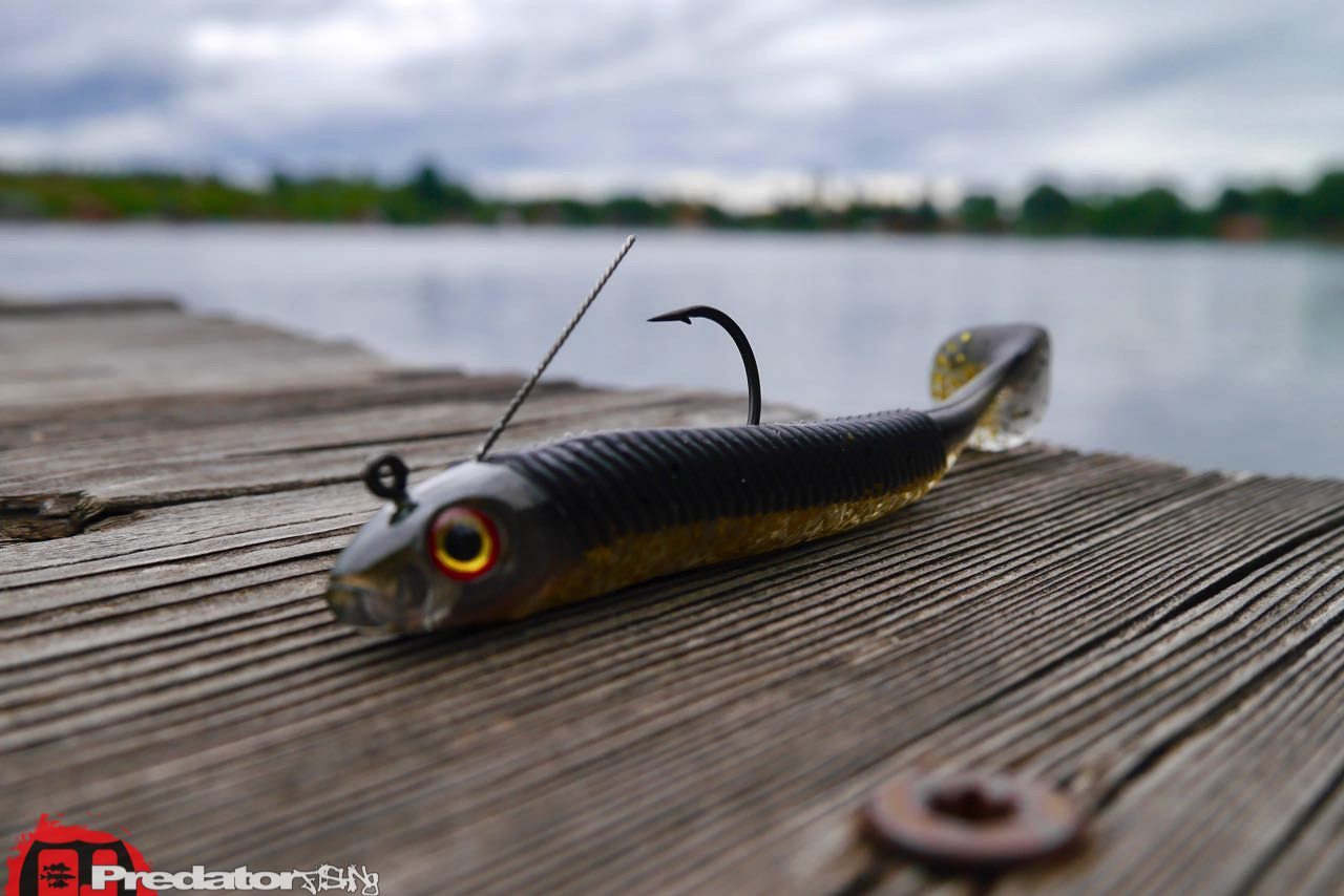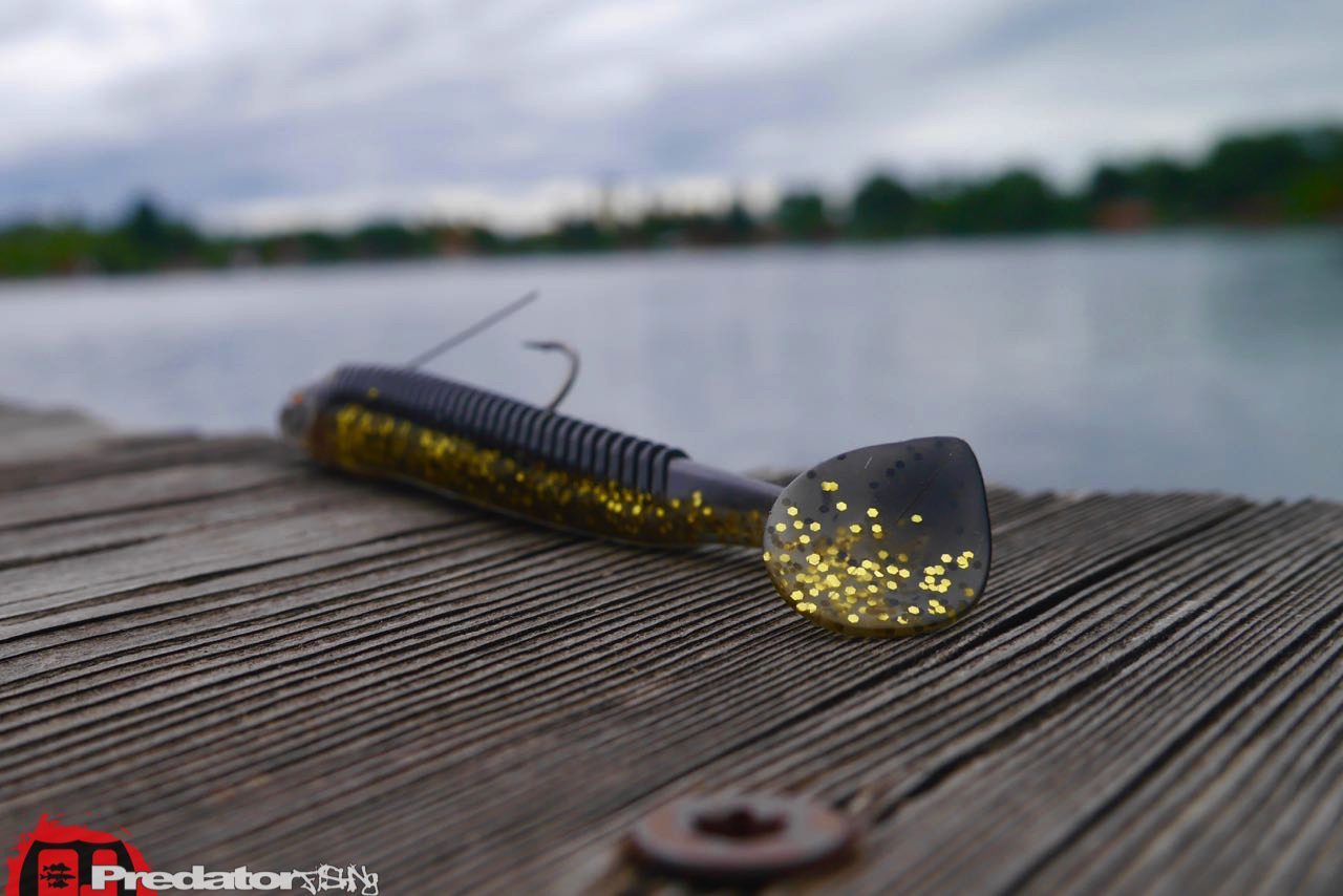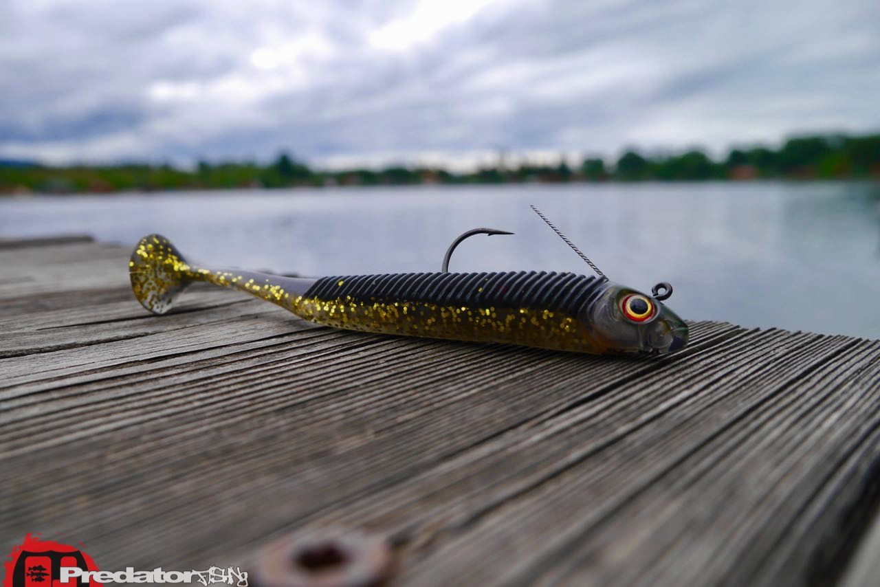 Zur Oberfläche des STORM 360GT Searchbait ist noch zu erwähnen, dass die vorderen zwei Drittel des Köders mit schräg angeordneten Gummi-Rippen versehen sind, welche über die Rasseln im Jigkopf und dem Metall-Haken zusätzliche, feine Vibrationen an die Umgebung abgeben sollen. Dieser Effekt ist meiner Meinung nach nicht zu unterschätzen, da ich schon öfter die Erfahrung gemacht habe, dass ein komplett aufgerauter und durch Hechtzähe zerschnittener Softbait bedeutend besser fängt, als ein frischer Softbait aus der Blisterverpackung. Anscheinend sind es feine Vibrationen oder Geräusche welche durch die rauere Oberfläche erzeugt werden, die hier die Raubfische wie Hecht, Zander und Barsch „bissiger“ machen, als wenn so ein aalglatter Köder vor ihnen vorbeigezogen wird.